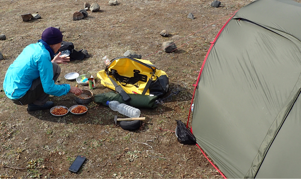 L’intérêt est de faire les courses dès que je peux pour transporter le moins de chose possible. L’autre point fort de cette méthode est de n’avoir besoin que d’un réchaud et d’une popote basiques puisqu’il n’y a que de l’eau à faire chauffer. Pas d’huile ou autre à transporter. Juste un peu de sel et des condiments acheté sur place en fonction des besoins.