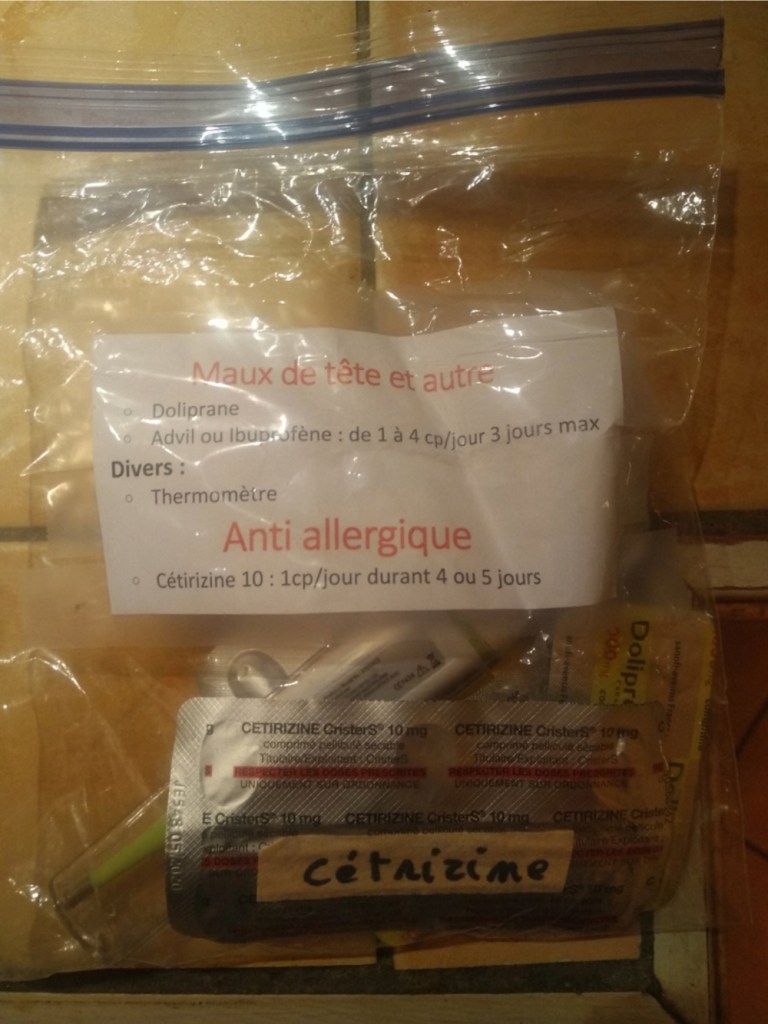 Voilà pour mes usages standards. Evidement je l’adapte aux régions où je vais. Par exemple, durant mes deux années passées en Afrique j’avais de quoi traiter le paludisme.
