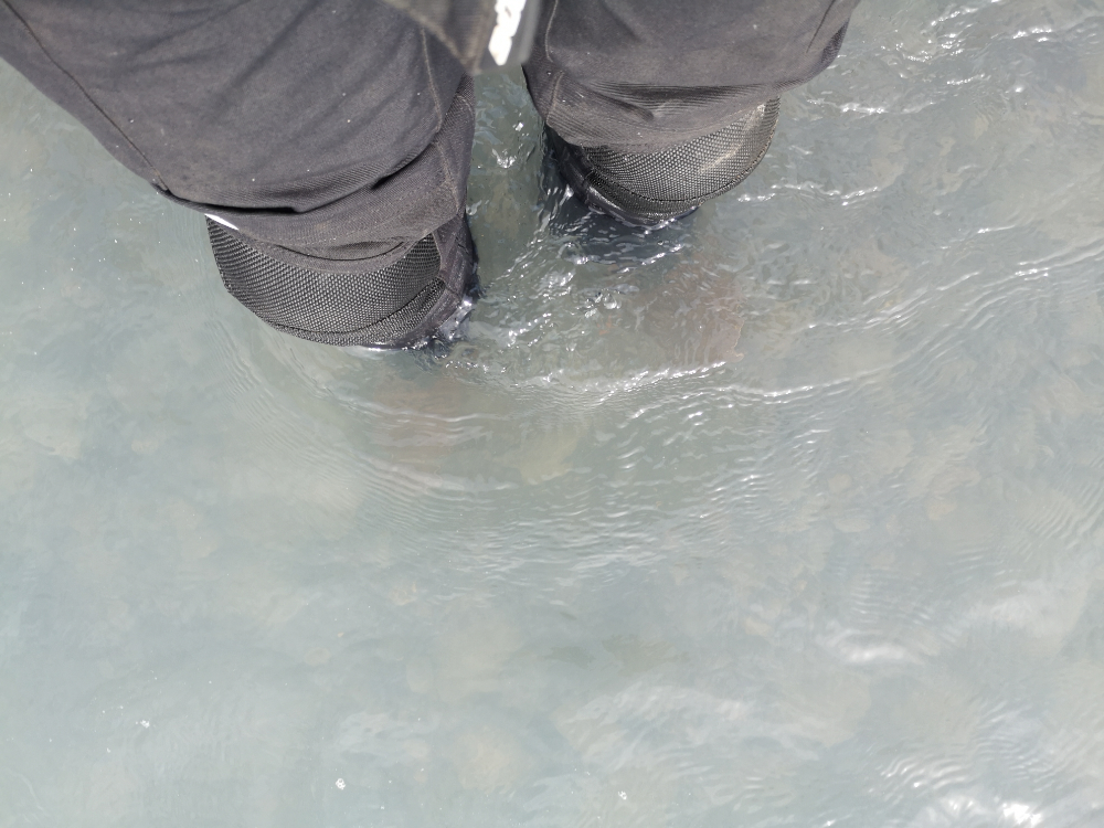 Traverser la rivière à pied, cela signifie avoir les orteils mouillés, même avec des bottes étanches. Quand il est indispensable de tester un gué au préalable, c’est que le niveau d’eau est supérieur à la hauteur des bottes. L’eau passera par-dessus et de toute façon, les inserts étanches ne montent pas jusqu’en haut.