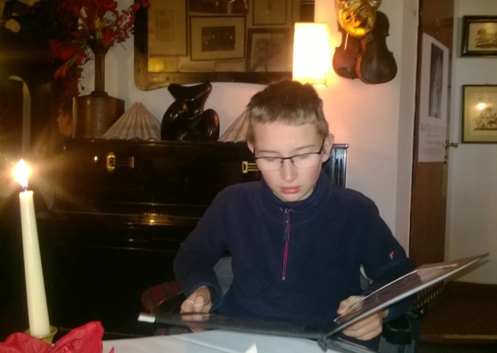 Très bon et copieux repas servi par une jeune autrichienne aussi belle que prévenante. Je laisse Raphaël parler. Il apprend l’allemand au collège. Cela s’appelle une mise en situation.