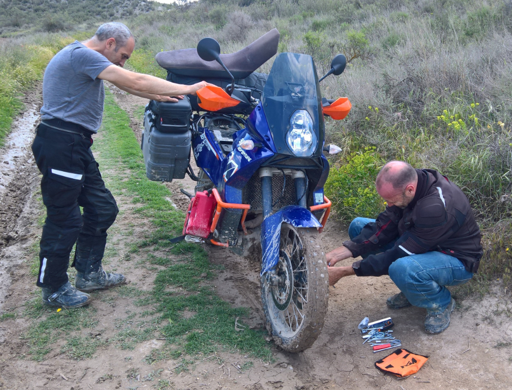 Dernier exemple. Regardez la photo ci-dessous, le TKC80 de la KTM est complètement colmaté de boue si bien que cela frotte sur le garde boue. D’où l’opération démontage de celui-ci. Si d’aventure vous étiez amené à faire de même, prenez garde aux durites de frein. En général elle sont maintenue en place par un passage dans le garde boue. Quand on le démonte elle se trouvent libre et peuvent facilement s’accrocher à une branche ou autre. Pensez alors à les fixer aux tubes de fourches avec un rilsan mais avec suffisamment de jeu, il faut qu’elles puissent coulisser.