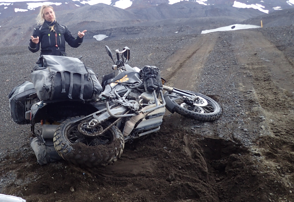 Elles ont été soumises à rude épreuve durant ces années car vous l’aurez deviné, elles servent d’air bag lors des chutes en tout terrain et encaissent tout le poids de la moto chargée. Par exemple ici, les cailloux étaient tellement glissants que la moto a ripée sur plusieurs mètres. La sacoche dessous s’en est sortie sans aucune égratignure!