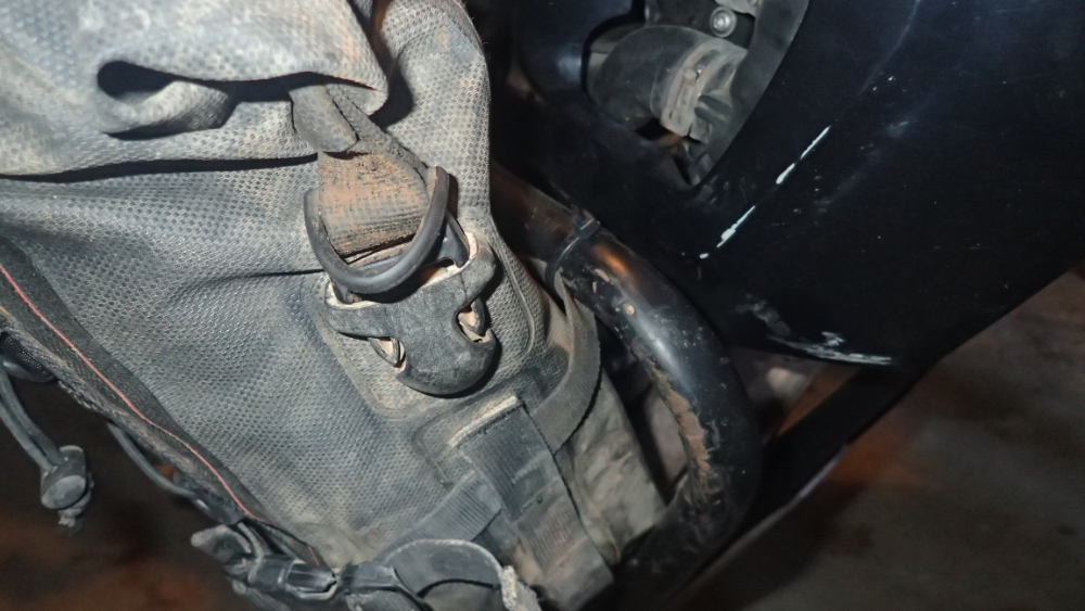 A la base, ce n’était que pour tester la bonne position des sacoches sur mes crash bars et, au final, ce fut la solution miracle … enfin, jusqu’à la première grosse gamelle en tout terrain. Et là, déception, une des soudure des sangles sur la sacoche a lâché. Damned! Je fais un petit bricolage de fortune histoire de pouvoir rentrer chez moi. Comme je suis du genre têtu, je commence par réparer la sacoche. Boulon, écrou, rondelle et silicone pour l’étanchéité. Voilà le résultat.