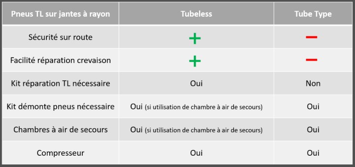 La stratégie optimale en voyage est d’avoir des jantes à rayons Tubeless avec des pneus Tubeless