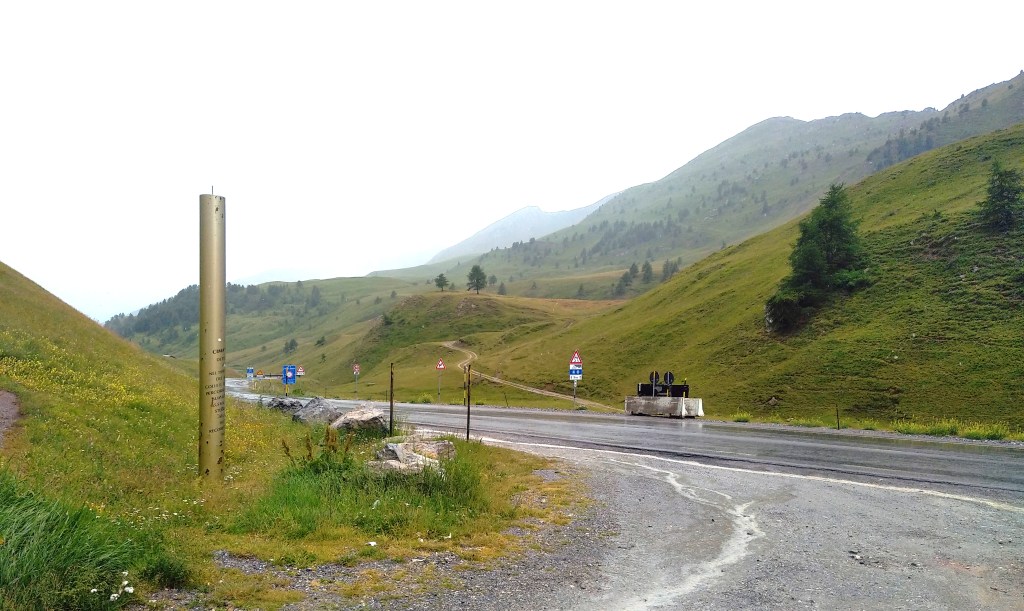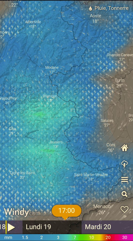 Nous reprenons la route et passons par Barcelonnette avant de piquer sur l’Italie. La vie est belle … jusqu’à ce que la météo décide de nous jouer un vilain tour. Le ciel s’obscurcit et les prévisions sont moroses. Nous mettons cap droit sur les orages et la pluie s’invite au passage du col délimitant la frontière.