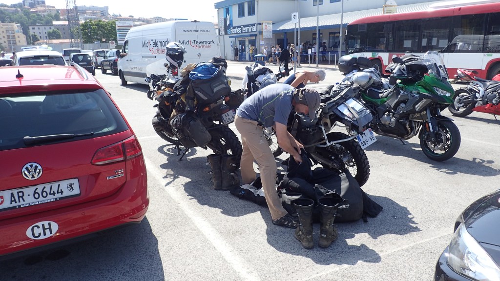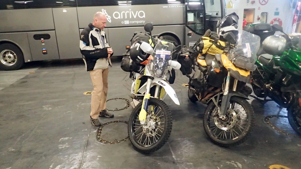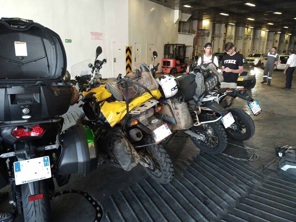 Et là, c’est l’improvisation totale. Rien d’organisé, excepté pour les poids lourds. Quel contraste avec la rigueur des pays scandinaves ! Mais peu importe, nous n’en sommes pas à notre coup d’essai et, in fine, les motos trouvent leur place à bord.