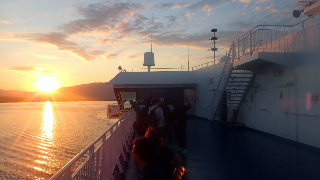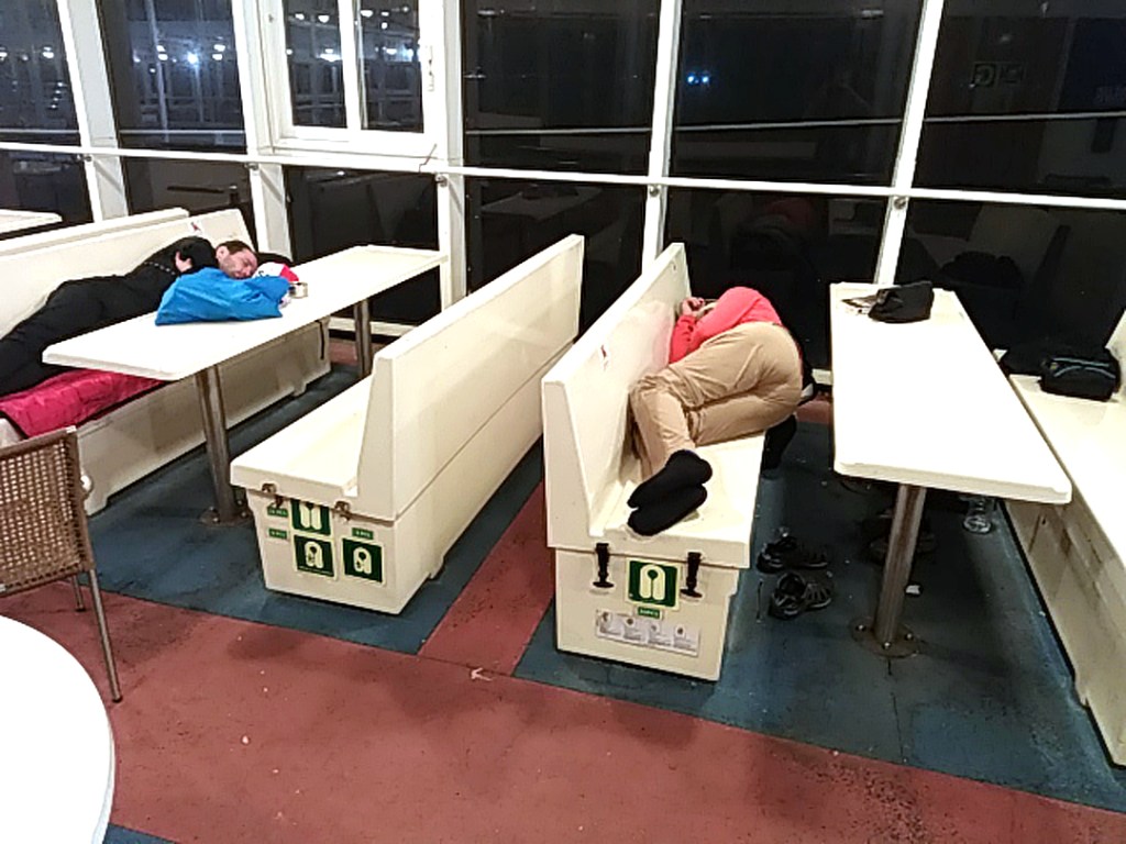 Il nous reste deux heures à attendre pour embarquer, largement de quoi prendre le temps de réaménager les bagages pour n’emporter qu’un petit sac pour la traversée.