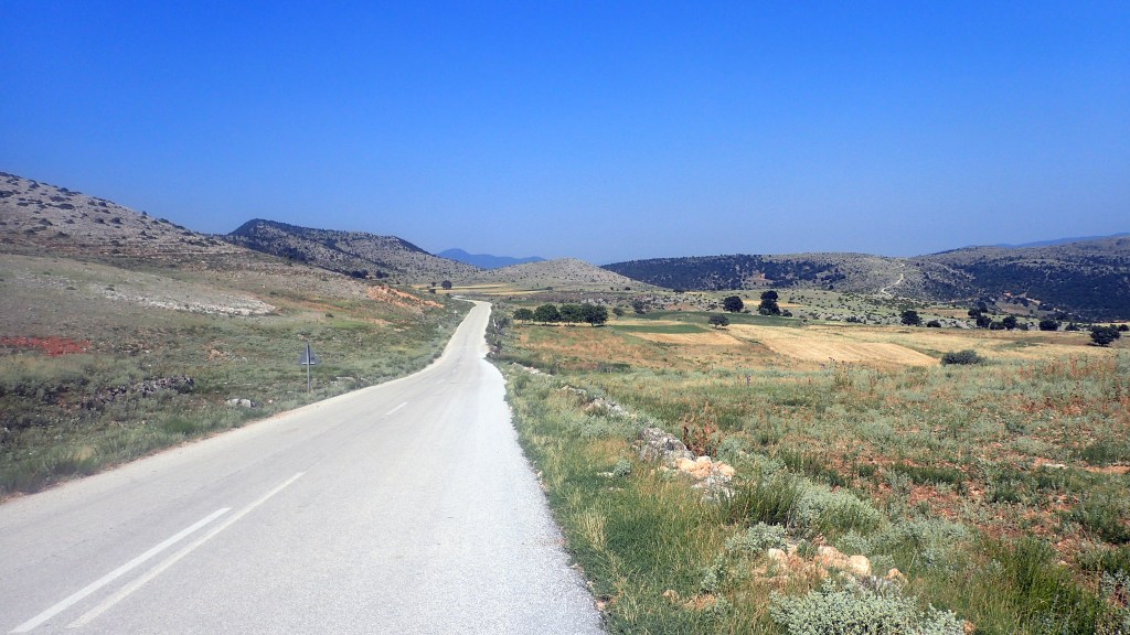 Nous reprenons la route. Plus nous nous enfonçons dans les montagnes, plus les paysages changent, ressemblant plus à ce que j’imaginais de mes lectures anciennes sur les grandes épopées de l’antiquité. Car oui, pour information, c’est la première fois que je roule en Grèce. A ce jour, il ne me reste donc plus que deux pays européens où je n’ai jamais été trainer, la Serbie et le Kosovo.