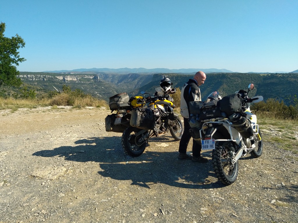Une fois extrait de la circulation de la métropole toulousaine, nous attaquons rapidement les petites départementales du Tarn, de l’Aveyron et de la Lozère. Nous enroulons les virages à un rythme soutenu et, le tout, sous un soleil radieux. Tout va pour le mieux. La Lozère et l’Ardèche sont avalées d’une traite ponctuées par les inévitables arrêts ravitaillement. Le sourire semble directement proportionnel au nombre de virages enchainés et aux paysages toujours aussi enchanteurs de ces contrées.