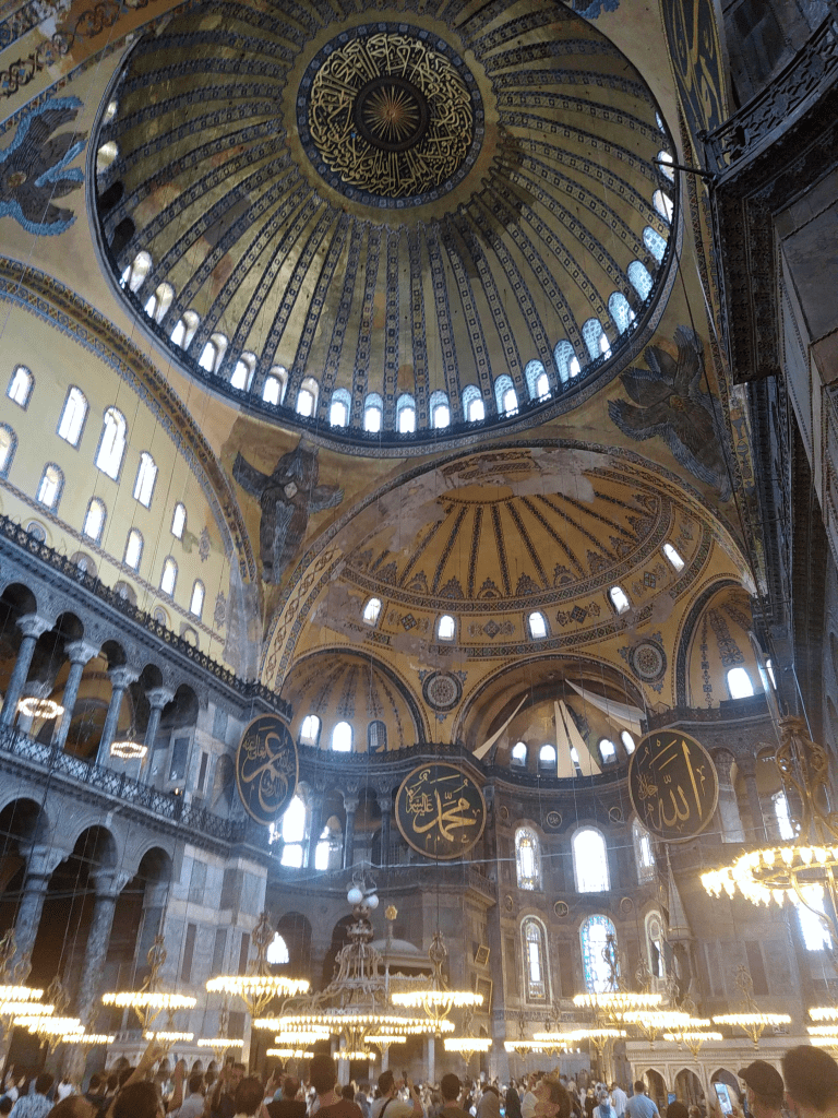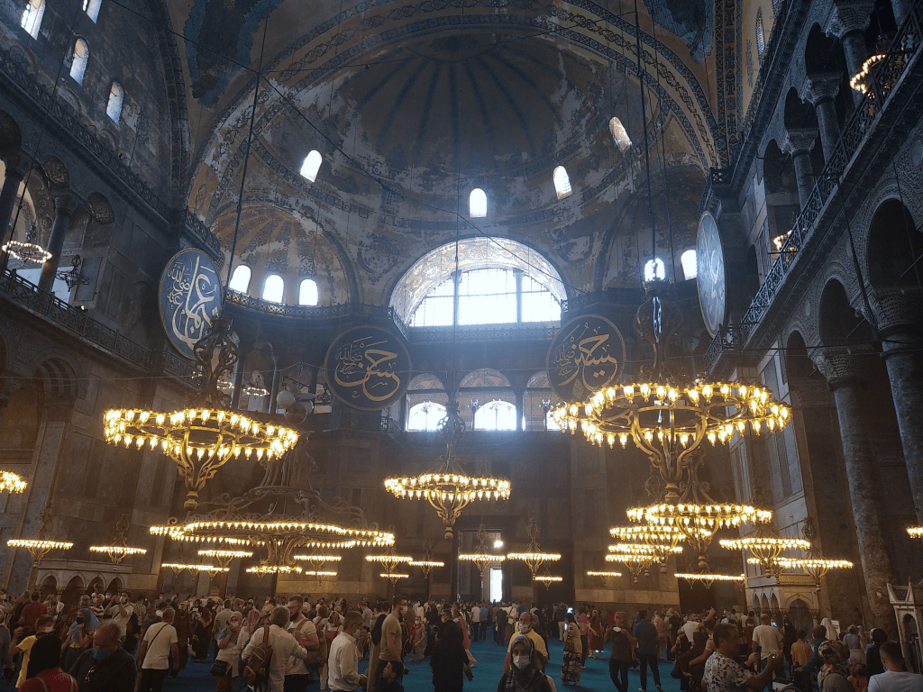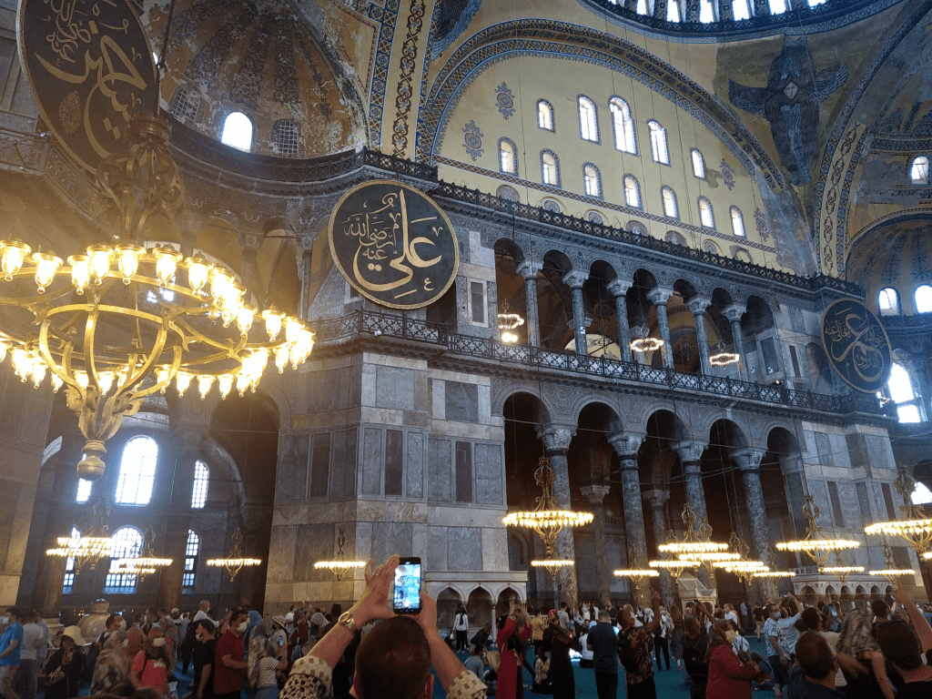 Mais c’est sous cet angle là qu’elle prend tout son sens, résultat d’une histoire incroyable. En effet, construite en un temps record par les Byzantins, moins de six années pour réussir une prouesse architecturale : construire le plus grand dôme de l’époque après le colysée de Rome. Suite à des tremblements de terre, il s’effondrera et sera aussitôt reconstruit. Chaque nouveau maître de la cité va alors y aller de ses travaux de consolidation et d’embellissement. Elle passera du statut de basilique à celui de mosquée, puis de musée pour enfin, tout récemment en 2020, redevenir un lieu de culte. Il en résulte aujourd’hui ce patchwork improbable, pas des plus esthétique, il faut bien l’avouer, mais qui dégage une impression … d’universalité.