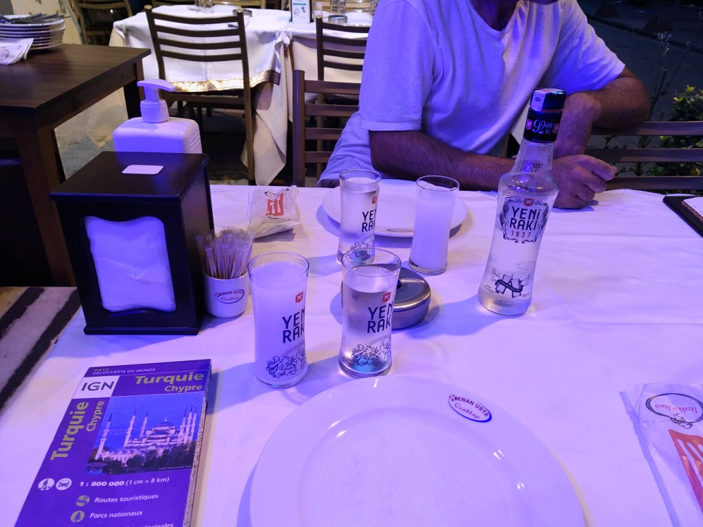 Encore une journée riche en émotions et sensations, certes, mais au prix d’une épuisante journée de marche. Une douche et un peu de repos à l’hôtel nous permettrons de recouvrer suffisant d’énergie pour retourner passer la soirée en ville, boire une bière et s’attabler à un restaurant où je ferais goûter à Arnaud le traditionnel Raki.
