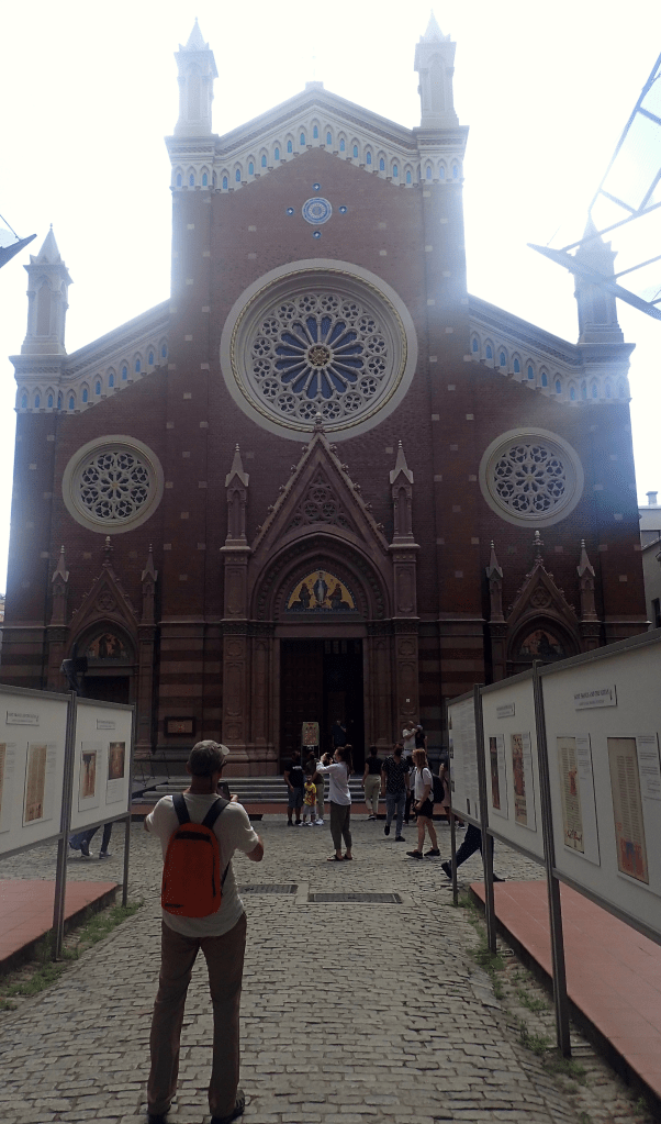 Des basiliques, elle a emprunté les nefs des murs centraux, des mosquées, les coupoles, celle du centre, complète, et les deux demi aux extrémités. Des médaillons comportant des versets du coran jouxte des fresques représentant des anges de l’ère chrétienne. Nouveauté, tout au fond, des rideaux blancs viennent cacher certaines peintures lors des offices religieux.