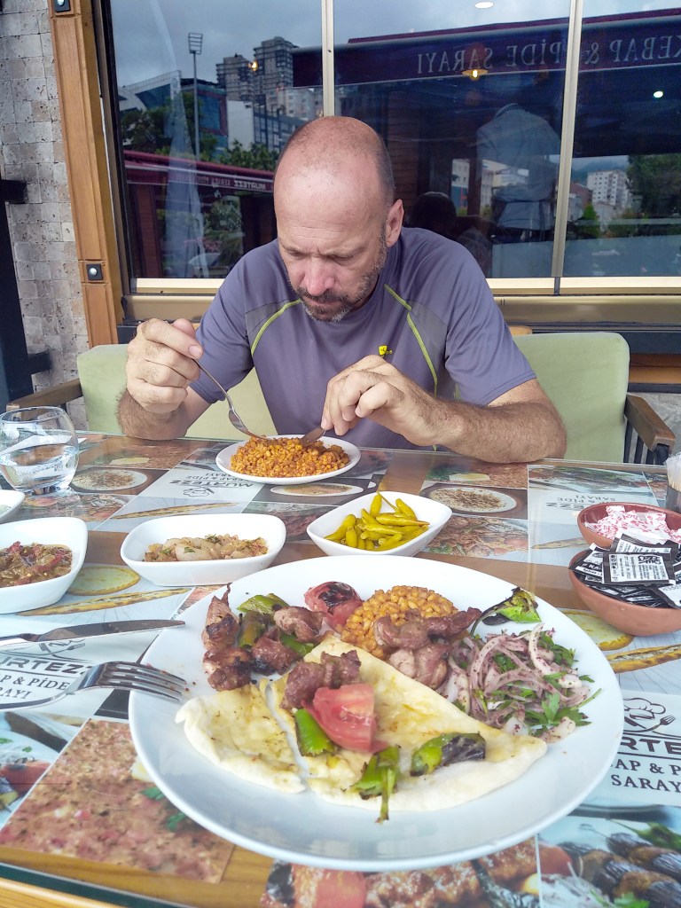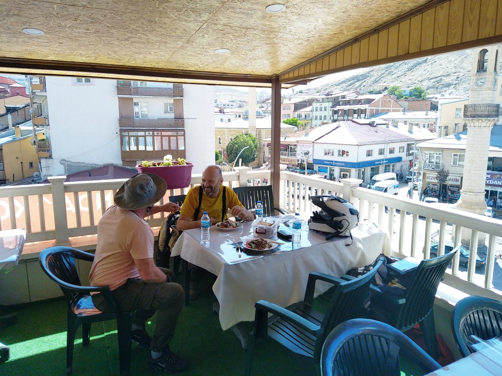 Timing parfait, nous arrivons à Baybirt à l’heure du déjeuner. C’est jour de marché et la ville est animée d’un joyeux capharnaüm rendant la circulation difficile, même en moto. Nous nous arrêtons plusieurs fois demander où se restaurer quand nous rencontrons un turc parlant parfaitement français. Il se propose de nous guider. Nous posons les motos et le suivons au dernier étage d’un restaurant avec vu sur la ville. Naturellement nous l’invitons à se joindre à nous. Nous voici tous trois attablés ravis de pouvoir discuter.