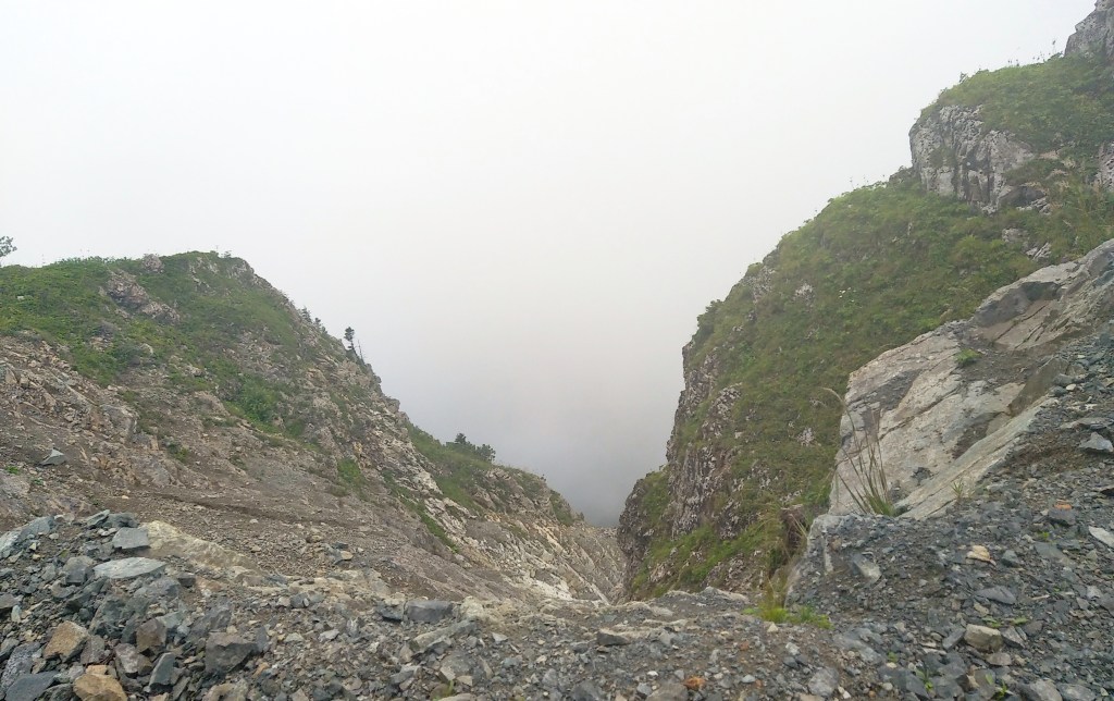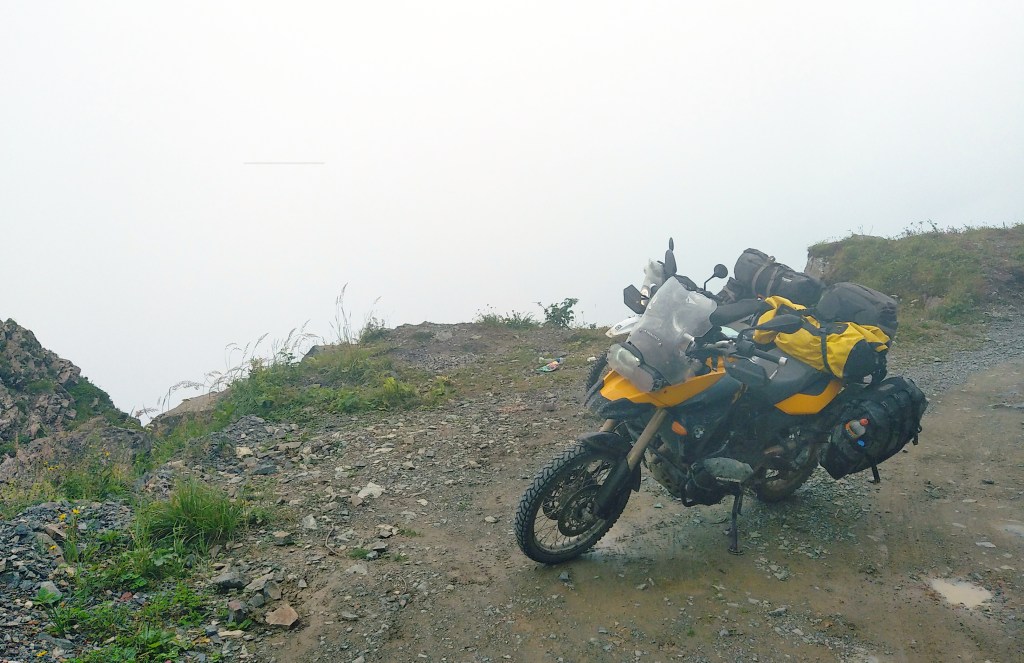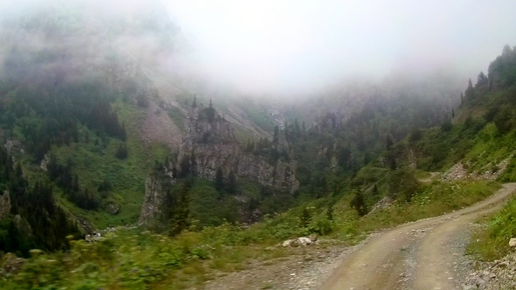 Plus nous grimpons, plus la visibilité est restreinte et plus la piste se rétrécie. Aucun soucis en moto, mais se croiser ici à deux voitures doit être des plus sportif et dangereux vu l’impressionnant ravin jouxtant la route.