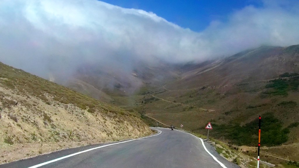 Une fois le col passé dans une purée de pois digne du big smog londonien, la descente se fait sans soucis et, excusez du peu, sous le soleil. La magie de la météo de montagne. Si l’ascension était plutôt stressante, nous nous rattrapons en enroulant virages après virages, profitant de la puissance de nos motos enfin exploitable sur cet asphalte au grip parfait.