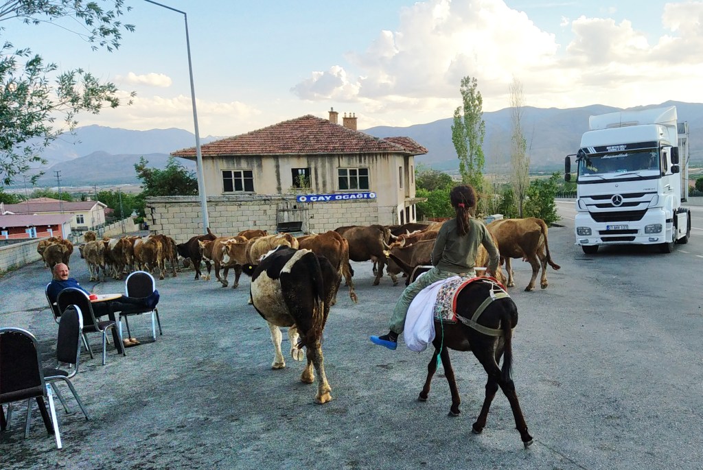 Arnaud étant aux courses, je tue le temps sur le parking lorsque mon attention est attirée par une jeune cow-girl locale juchée sur son âne ramenant le troupeau familial au bercail. Si jeune et pourtant quelle assurance et surtout, quelle responsabilité !