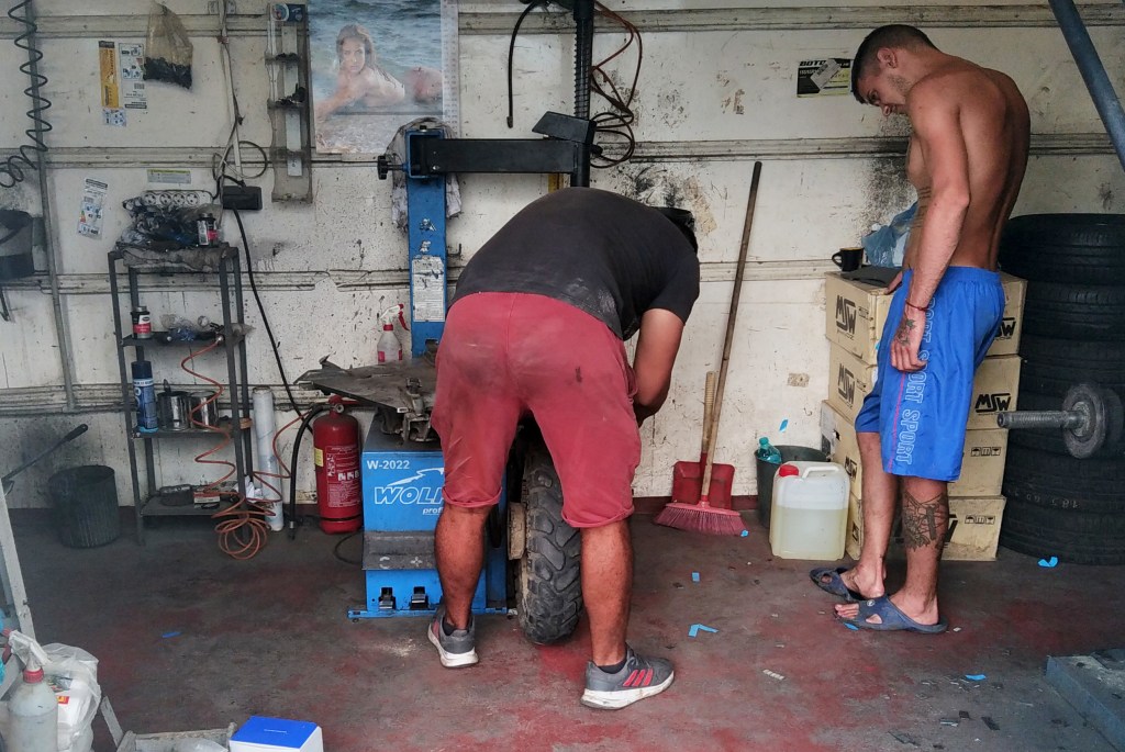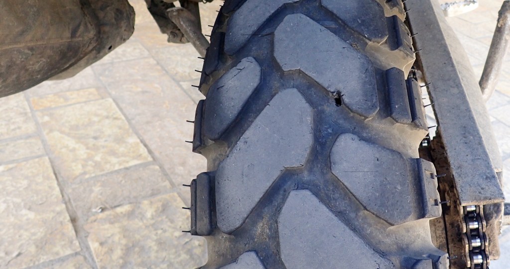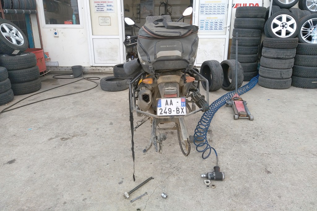 Je ne peux que constater mon pneu à plat. J’ai bien de quoi réparer mais il se fait tard et je suis d’un naturel faignant. Changer de chambre à air au démonte pneus est faisable, mais cela reste une épreuve harassante. Je regarde sur Osmand et vois que la prochaine ville, Plovdiv, est à moins de dix kilomètres. Je décide alors de repartir et de rouler à plat. Merci les Mitas Dakar hyper rigides qui se décollent sans déjanter. Je roule warnings allumés à 50 km/h jusqu’à trouver un garage. Sur le point de fermer, ils acceptent néanmoins bien volontiers de m’aider. C’est tout de suite plus facile lorsqu’un professionnel se charge du travail.