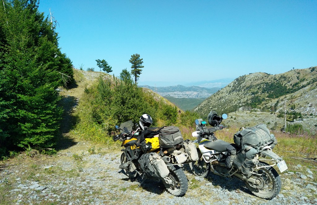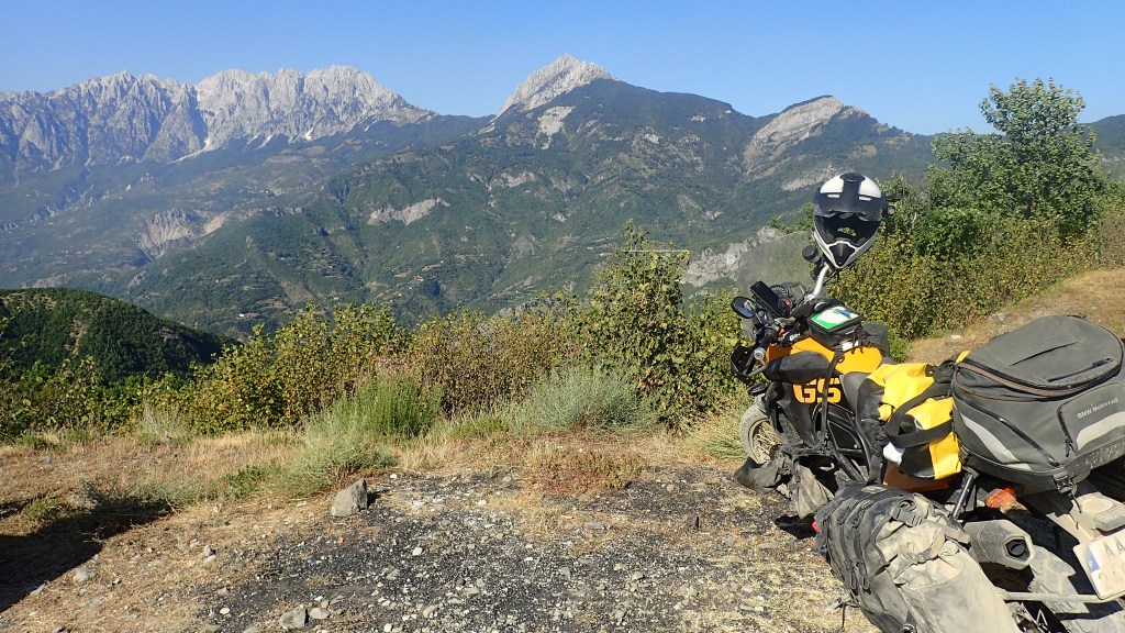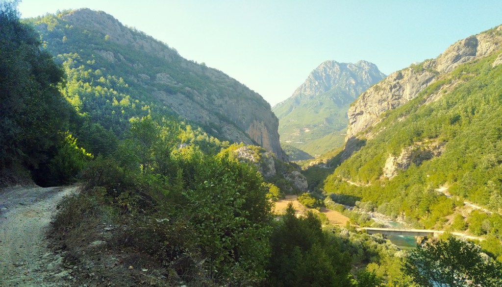 La route est belle, une succession de courbes et de virages, source de plaisir infini pour les motards que nous sommes. Mais voilà, comme souvent en Albanie, l’asphalte laisse place à une gravel road qui, bientôt, se transforme en piste qui, elle aussi, progressivement se mue en chemin.